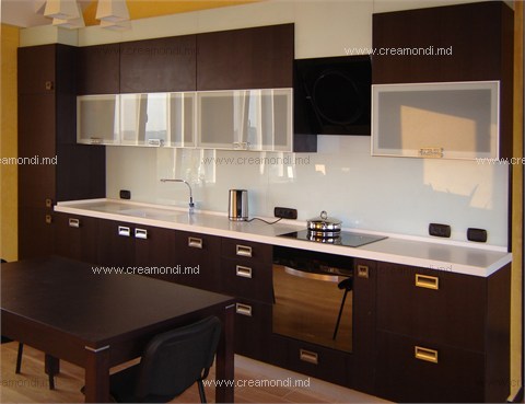 Линейная кухня. Фасады на кухне изготовлены из шпона TABU (Италия). Столешница -- искусственный камень. Рабочая стенка и верхний карниз -- стекло цветное Lacobel (Чехия).Ручки -- Siro (Австрия). В левый пенал встроен холодильник.