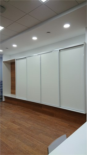 Вся длина конструкции составляет 5,5 метров, из которых 4 метра отданы для шкафа. Конструкция установлена на специальный подиум, который мы отделали ламинированным паркетом. Им же оформили и заднюю стенку в открытой зоне. Профили раздвижных дверей мы окрасили в белый цвет. Теперь вся конструкция выглядит максимально интегрированной.