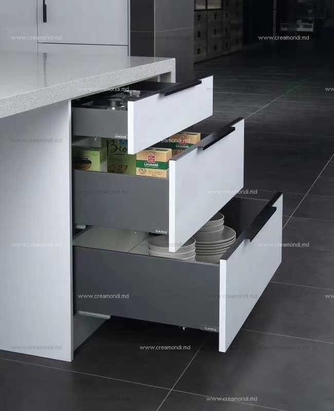 Направляющие для выдвижных ящиков скрытого монтажа с металлическими бортами- MINIBOX. - полное выдвижение; - плавное закрывание; - общая нагрузка- 30 кг.